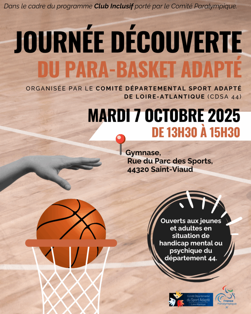 Nous avons le plaisir de vous inviter à participer à une journée découverte du Para-Basket Adapté, organisée par le Comité Départemental Sport Adapté de Loire-Atlantique (CDSA 44) dans le cadre du programme Club Inclusifporté par le Comité Paralympique.