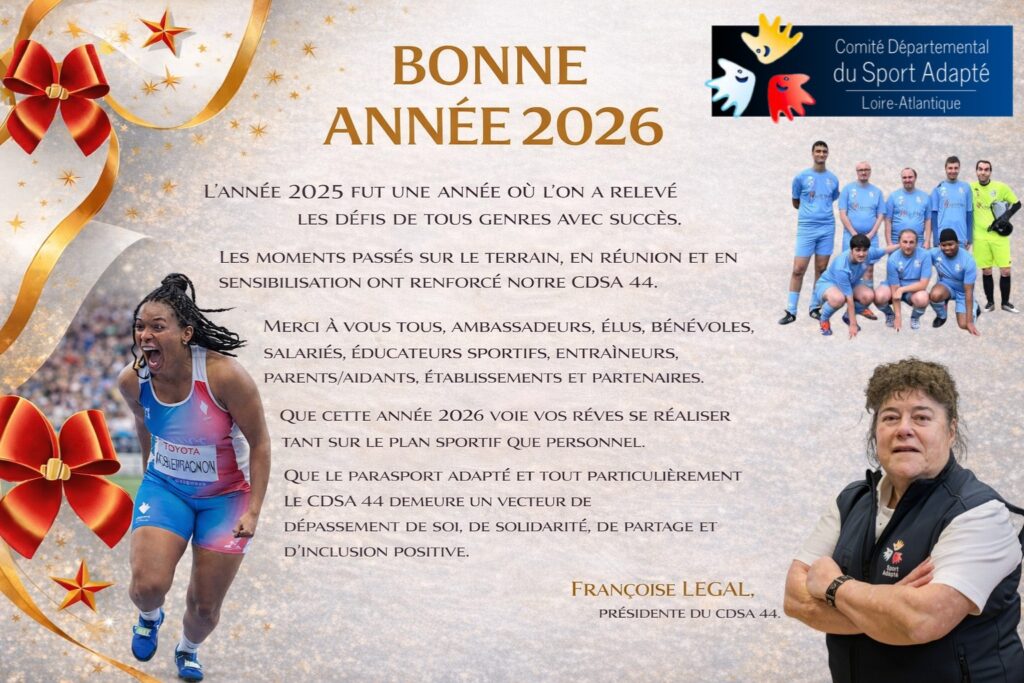 À l’aube de cette nouvelle année, je souhaite, au nom du Comité Départemental du Sport Adapté de Loire-Atlantique et en mon nom personnel, vous adresser mes vœux les plus sincères.