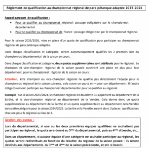 Comme la saison passée, vous trouverez en pièce jointe la feuille des quotas de qualification pour le championnat régional de pétanque.👉 Le fonctionnement reste identique à celui de l’an dernier. 🆕 Nouveauté cette saison : ouverture de la classe DE➡️ Pour cette première année, 10 places sont ouvertes au tableau➡️ Soit 2 qualifiés par département,…
