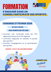 La Ligue Sport Adapté des Pays de la Loire vous propose une journée de formation intitulée : « S’ENGAGER DANS UN CONSEIL PARTICIPATIF DES SPORTIFS » Pourquoi ? En échangeant avec vous, plusieurs freins ont été identifiés : C’est pourquoi nous avons fait appel à l’Académie pour nous aiguiller et améliorer les CPS Ligériens.   Les objectifs de la formation…