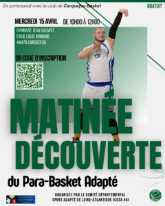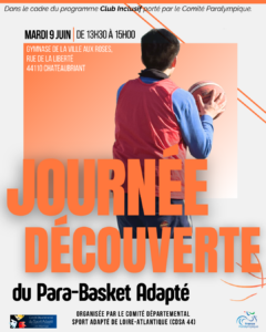 📅 Mercredi 15 avril 🕙 10h00 – 12h00 📍 Salle Jean Gauvrit – Carquefou Le Comité Départemental Sport Adapté 44, en partenariat avec le club de Carquefou Basket, vous propose une séance découverte gratuite de para basket adapté ! 👉 Objectif : découvrir la pratique à travers : 🏃♂️ Parcours moteur 🤾 Ateliers (dribble, passe,…