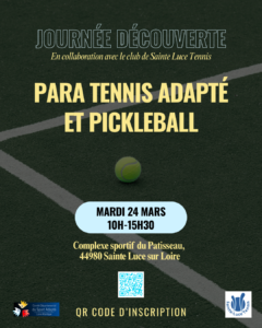 Rejoignez-nous pour une journée dédiée au para tennis adapté et au pickleball, ouverte à toutes et à tous ! Mardi 24 mars 10h – 15h30 Complexe sportif du Patisseau – Sainte-Luce-sur-Loire En collaboration avec le club de tennis de Sainte-Luce, cette journée sera placée sous le signe du partage, du plaisir et de la découverte…