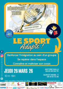 Jeudi 26 mars 2026 10h – 16h Salle raquettes – Chaumes-en-Retz Au programme : • Activités ludiques autour du tennis • Travail sur la coordination et la maîtrise du corps • Repérage dans l’espace • Moments de partage et d’intégration en groupe Goûter offert pour finir la journée dans la convivialité ! Infos & inscriptions…