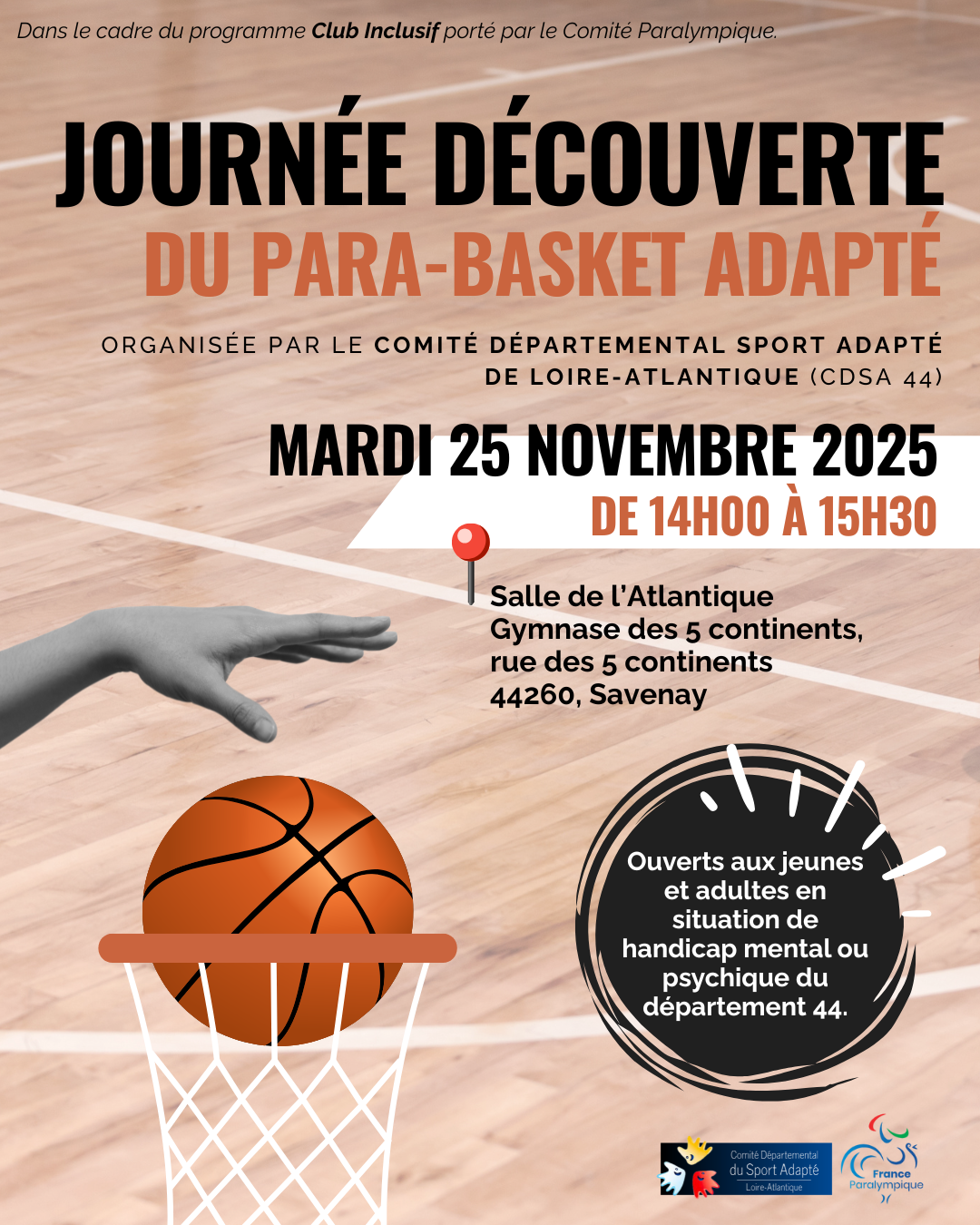 Nous avons le plaisir de vous inviter à participer à une séance découverte de Para-Basket Adapté, organisée par le Comité Départemental Sport Adapté de Loire-Atlantique (CDSA 44) dans le cadre du programme Club Inclusif, porté par le Comité Paralympique. 📅 Mardi 25 novembre 2025 🕑 De 14h00 à 15h30 📍 Salle de l’Atlantique – Gymnase des 5 Continents, rue…