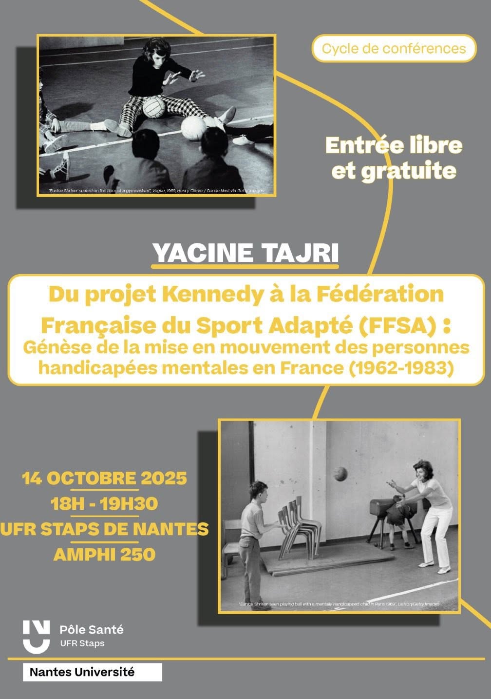 Du projet à la fédération française de sport adaptée (FFSA) : genèse de la mise en mouvement des personnes handicapées en France (1962-1983), présentée par Mr Yacine Tajri, agrégé d’EPS et maître de conférences à l’université Gustave Eiffel en STAPS, sur une proposition de Mr Sylvain Dufraisse. Cette conférence organisée dans le cadre du Cycle…