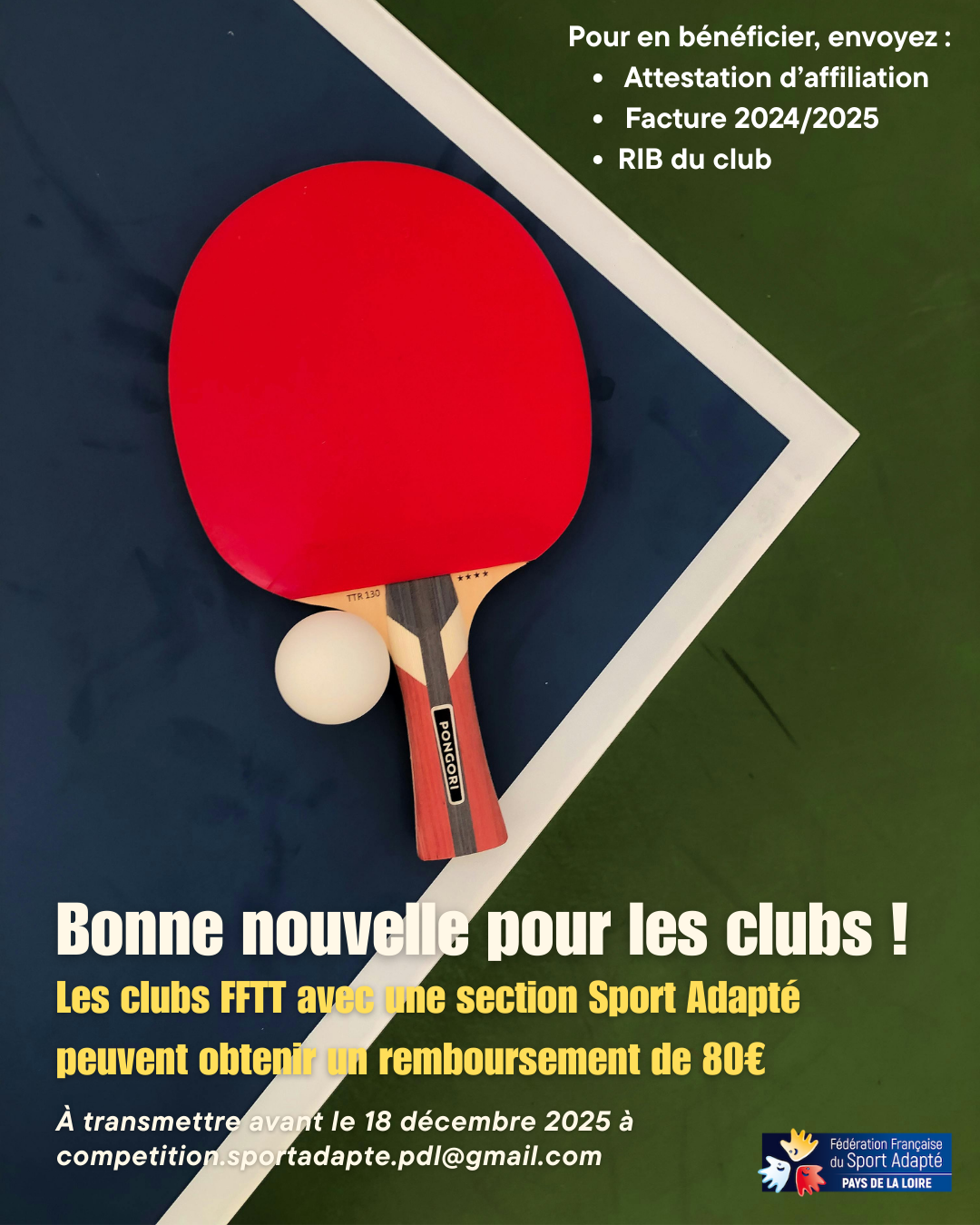 Dans le cadre de la convention régionale entre la Ligue Sport Adapté Pays de la Loire et la Ligue de Tennis de Table des Pays de la Loire, un soutien financier est mis en place 💪 ✨ Les clubs ayant une double affiliation FFSA / FFTT peuvent bénéficier du remboursement de 80€ correspondant à l’affiliation…