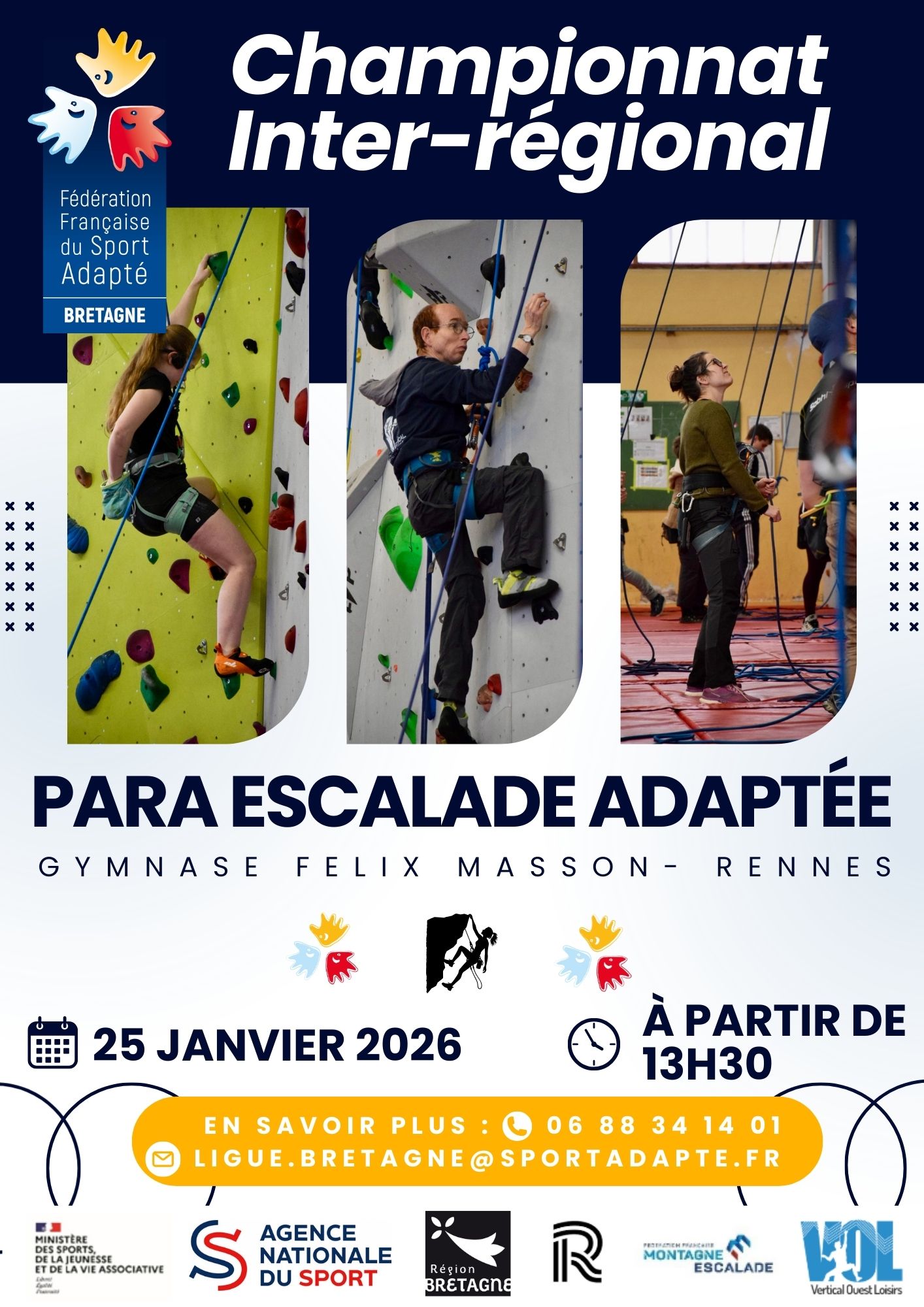 La Ligue de Bretagne Sport Adapté organise, en partenariat avec🤝 Vertical Ouest Loisirs de Rennes🤝 le CDSA 35, le Championnat Inter-Régional de Para Escalade Adaptée 💪✨ 📅 Dimanche 25 janvier 2026📍 Gymnase Félix Masson📌 5 Allée des Cévennes – 35000 Rennes 👉 Venez encourager les grimpeurs et partager un moment sportif fort en émotions !