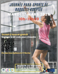 Dans le cadre de la Journée Para Sports de Raquette Adaptée, organisée par La Maison du Squash de Sautron en partenariat avec le CDSA 44, nous avons le plaisir de vous inviter à participer à cet événement sportif et convivial.